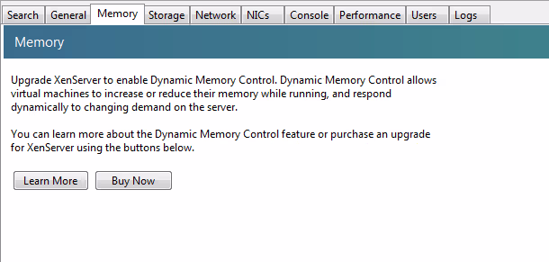 Autre déconvenue, quand on clique sur l’onglet Memory d’un serveur, on se retrouve malheureusement face à un message du type « Upgrade XenServer to enable Dynamic Memory Control ». Oui, la mémoire n’est pas attribuée dynamiquement. Il est donc très important de bien gérer sa RAM. J’ai très vite atteint mes 8 Go sur ma machine de test!