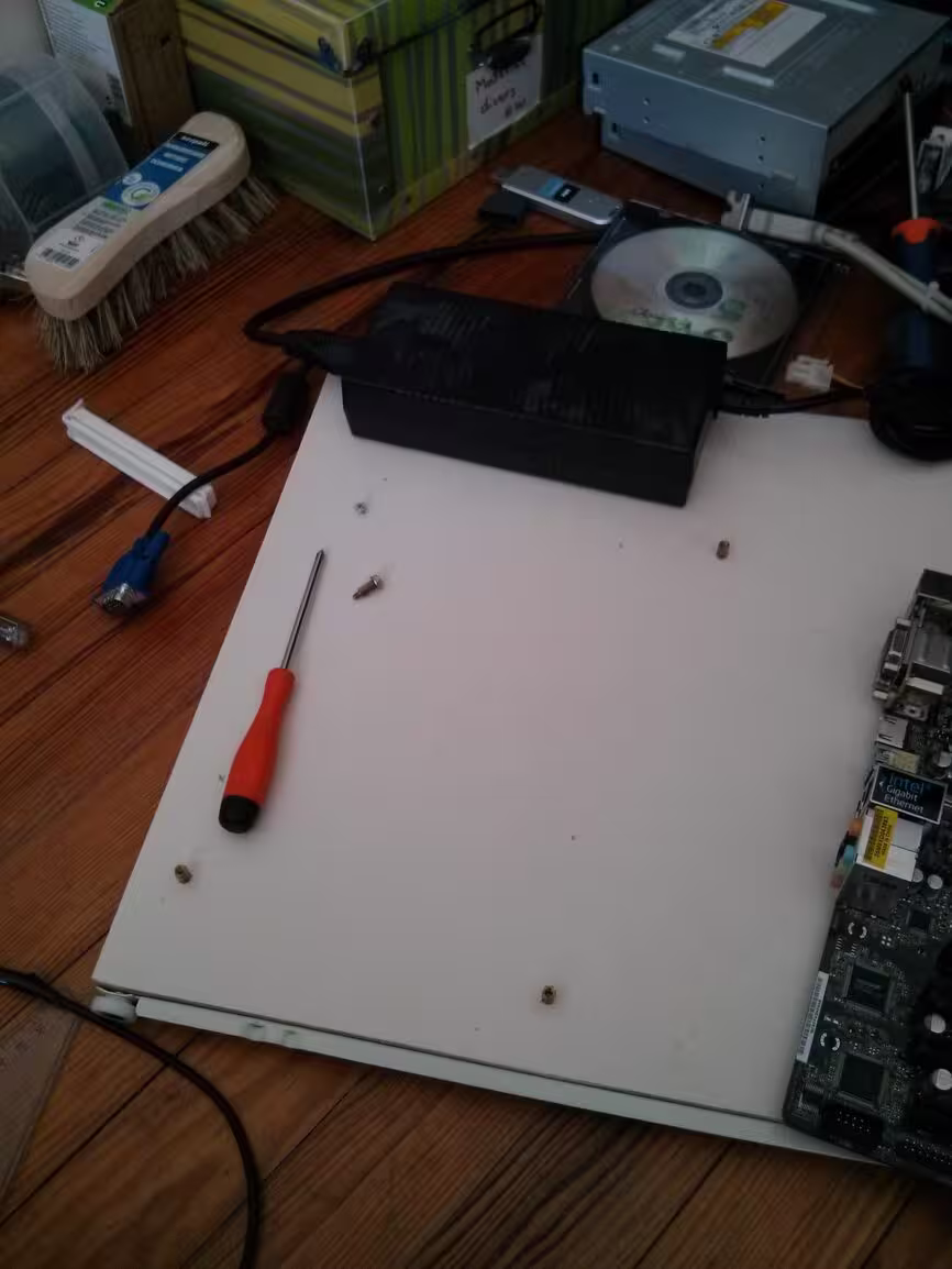 Montage de la carte mère sur la planche : grosse galère! J’ai utilisé un vis pour le pré-percage, puis j’ai forcé comme un malade pour faire rentrer les vis de laitons qui surélèvent la carte