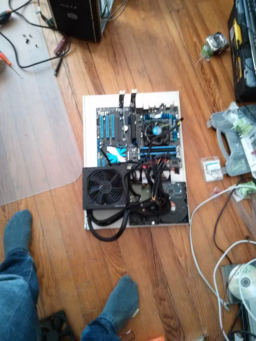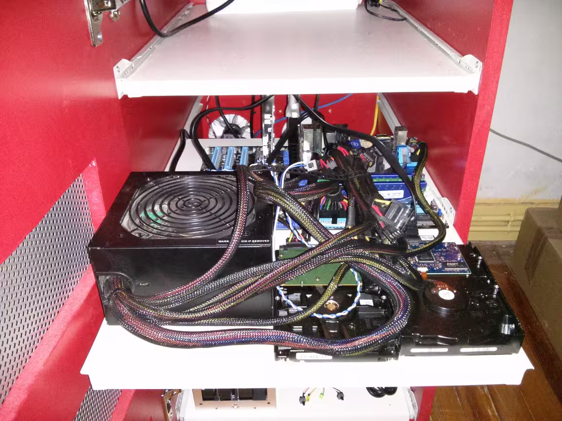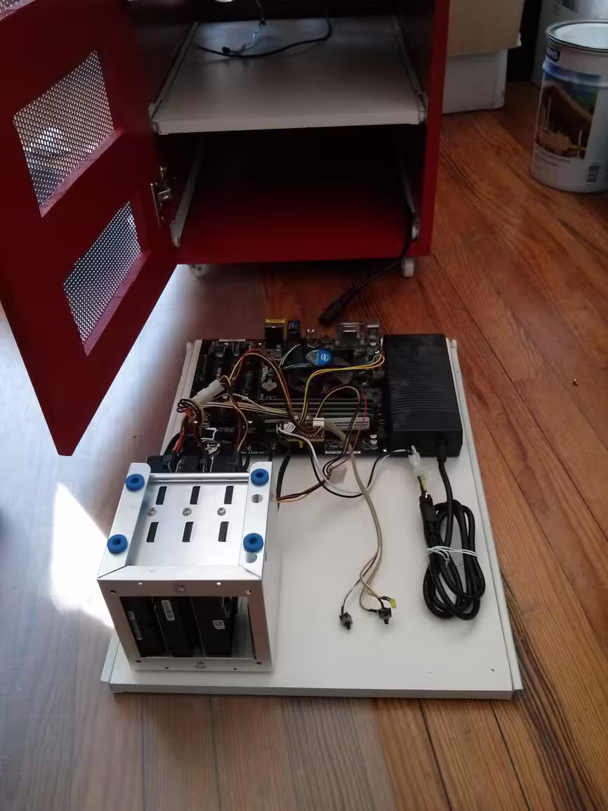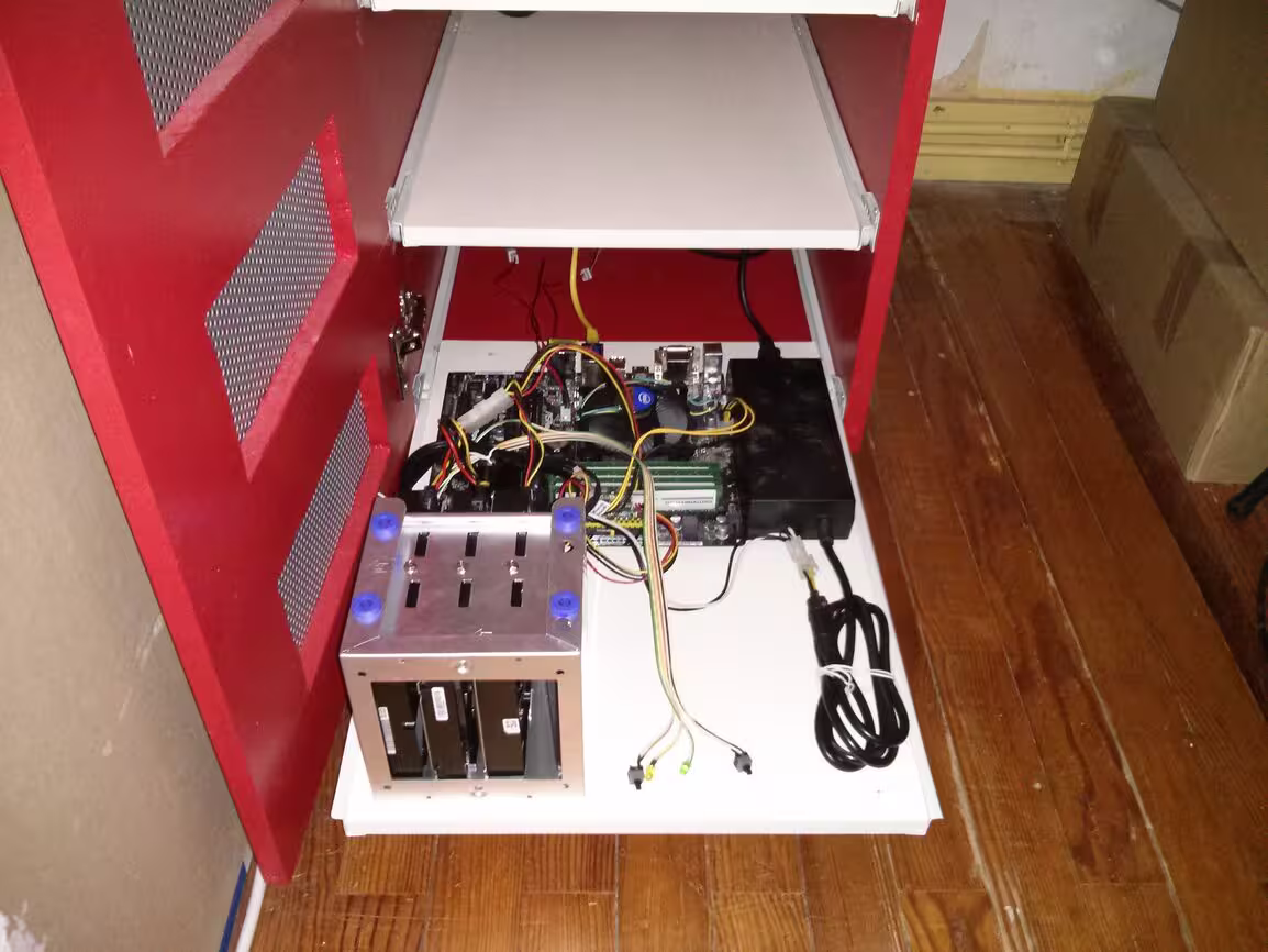 En mode flou, voici l’hyperviseur. Pour l’instant il est un peu à l’étroit mais il faut que je vais acheter une cage pour HDD comme pour le NAS, ça ira mieux. Une alim modulaire ne serait pas du luxe…