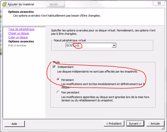 De la même manière que précédemment, on doit créer un disque dur virtuel sur un nouveau contrôleur SCSI et en mode Indépendant-Persistant.