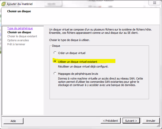 Ouvrir les paramètres de la machine virtuelle test_partage_vmdk_2, ajouter un nouveau périphérique (Disque dur) puis sélectionner « Utiliser un disque virtuel déjà configuré ».