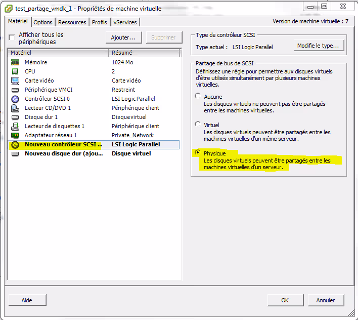 Une fois le disque créé, un nouveau contrôleur SCSI est également créé. Avant de valider la création du disque et du contrôleur SCSI, il faut modifier le paramètre de Partage de bus de SCSI en mode « Physique ».
