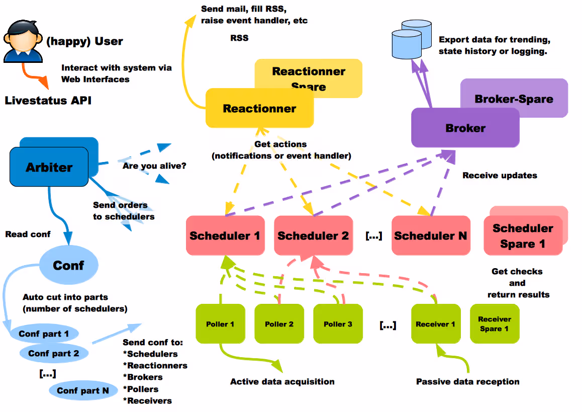 - l’arbiter est le chef de l’équipe. Il a la vision globale des démons et des modules. Du coup, il est responsable de découper la configuration générale vers les différents démons et gère la répartition de charge et la haute disponibilité.
