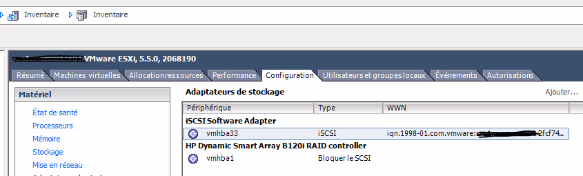 Ouvrez donc votre client VMware, allez dans la page d’administration du serveur, puis dans l’onglet Configuration puis sélectionner le menu Matériel/Adaptateur de Stockage, vérifier si la ligne iSCSI Software Adapter existe ou pas (ici c’est vmhba33).
