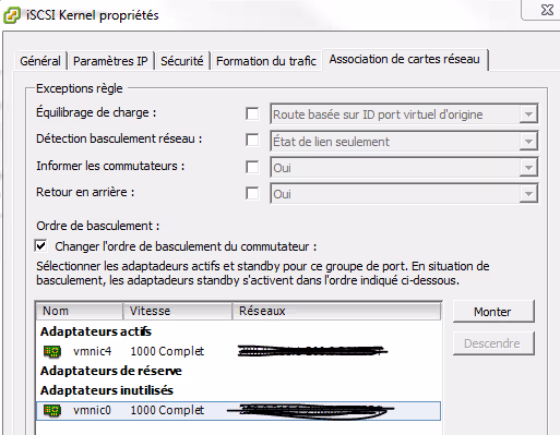 Dans l’onglet Association de cartes réseau, cocher Changer l’ordre de basculement du commutateur, puis déplacer la vmnic4 dans les Adaptateur inutilisés.