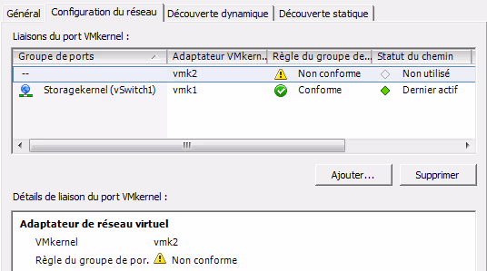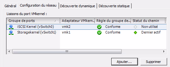 Dans l’onglet Configuration du réseau, cliquer sur Ajouter pour ajouter le nouveau VMKernel** iSCSI Kernel** remonte comme conforme (ici c’est vmk2).