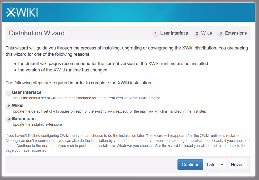 Attention : Ce qu’il faut savoir c’est que par défaut, les XWiki sont installés sans aucunes pages. Les pages par défaut doivent être chargées manuellement via un import la première fois. C’est à ça que sert le fichier xwiki-enterprise-ui-mainwiki-all-7.2.xar que vous avez téléchargé au début de la procédure.