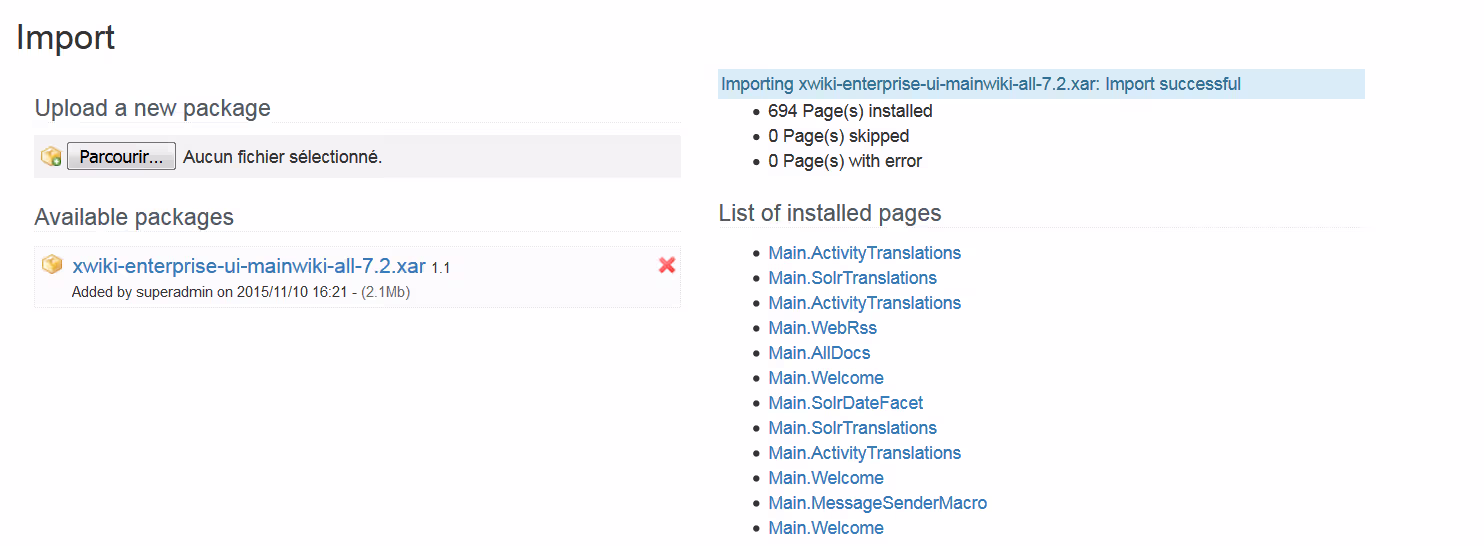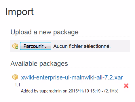 Cliquez sur « Import » et uploadez le fichier xwiki-enterprise-ui-mainwiki-all-7.2.xar préalablement téléchargé. Après upload, le package apparait dans « Available Packages »