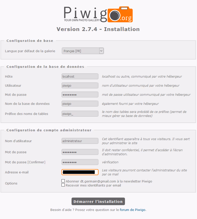A partir de là, on peut ouvrir la page d’installation http://@IPpiwigo/piwigo/piwigo-netinstall.php dans un navigateur web