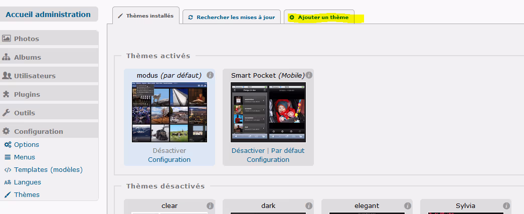 Et la seule chose à faire pour passer sur ce rendu est d’aller dans l’écran d’administration, puis dans Configuration/Thèmes et d’aller dans l’onglet Ajouter un thème.