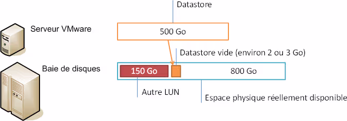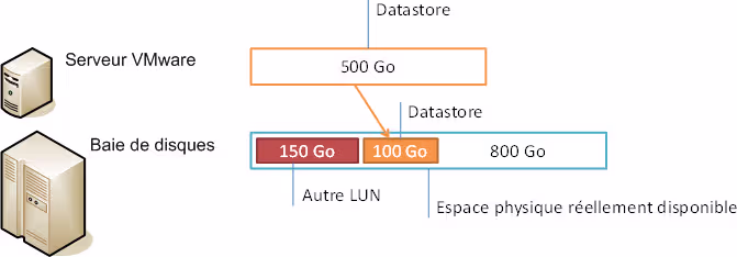 On dispose d’un LUN de 500 Go en Thin Provisioning, présenté à un serveur VMware. On a créé un Datastore dessus et ajouté un VMDK qui prend 100 Go. Comme le LUN est en Thin provisioning, seul 100 Go (environ) est réellement utilisé sur la baie de disques.