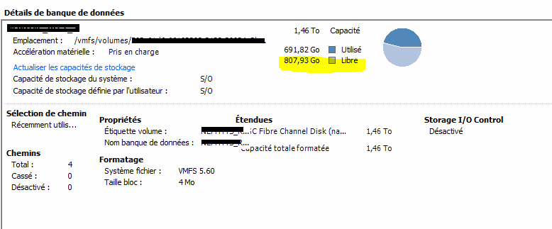 Pour une baie EMC de type VNX 5X00 et un LUN de 1500 Go. Le LUN fait 1460 Go sur la baie, pourtant beaucoup d’espace a été libéré sur le Datastore.