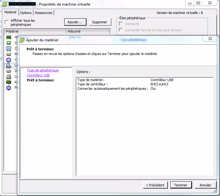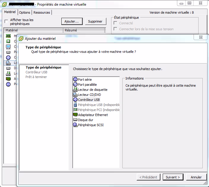 Une fois le module GSM installé sur le port série du convertisseur et le port USB connecté à l’hyperviseur, l’ajout du port USB se fait machine virtuelle arrêtée. Ouvrir le menu de modification de la machine virtuelle et ajouter d’abord un contrôleur USB.
