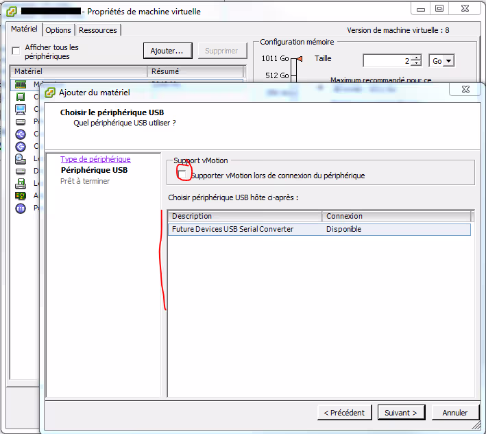 Ici je n’ai pas choisi de valider le support du vMotion. La machine ne pourra donc pas être basculée tant que le périphérique est « passé » à la VM.