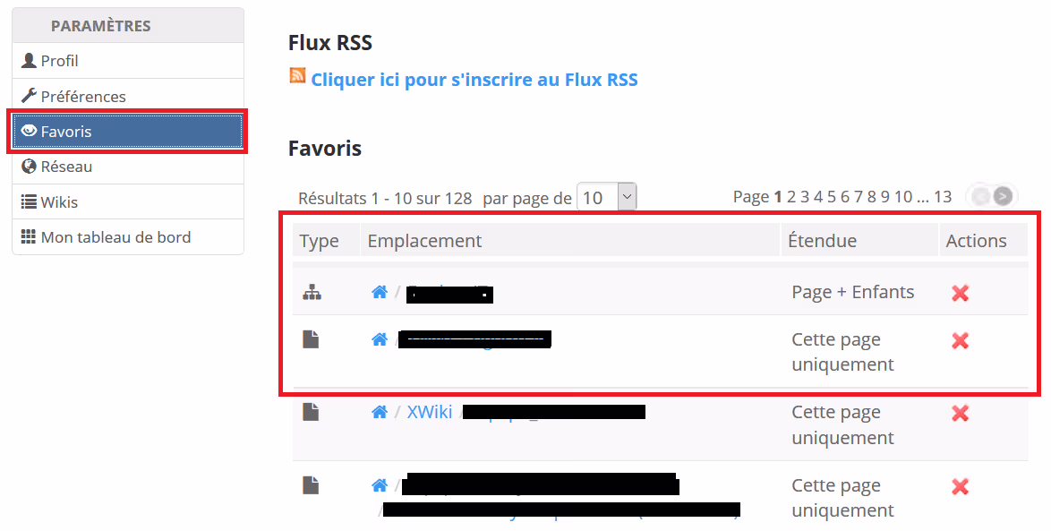 Les pages favorites sont sélectionnées automatiquement par XWiki si vous avez laissé les valeurs par défaut. Toutes les pages créées et auquel vous aurez contribué en tant qu’utilisateur seront automatiquement inscrites dans vos pages favorites.