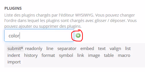 - Dans la section plugins, ajouter color et cliquer sur le symbole « + » pour valider l’ajout du module à l’éditeur.