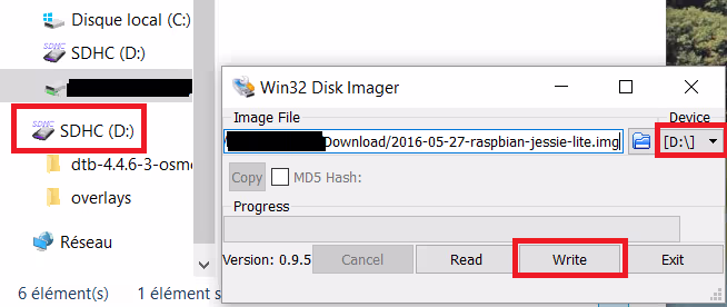 Télécharger un utilitaire pour copier « bloc à bloc » le fichier .img sur la carte SD. Pour Linux, un simple dd aurait fait l’affaire mais mon laptop est sous Windows donc on utilise win32diskimager disponible sur sourceforge.