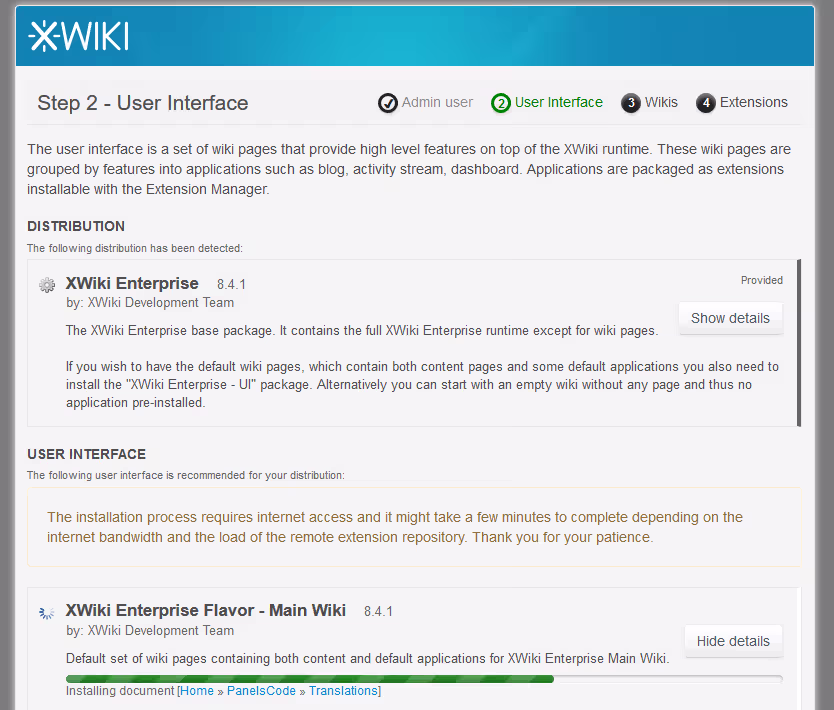 Si tout s’est bien passé, votre wiki a été mis à jour sans efforts et le « Distribution Wizard » de déploiement du XWiki devrait se lancer !