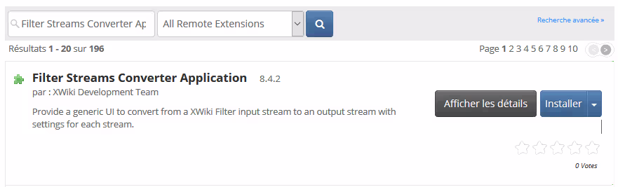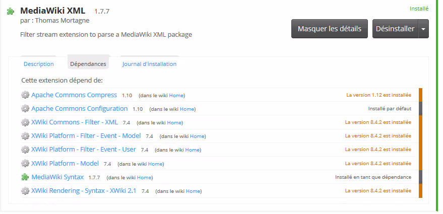 A noter, l’extension Filter Streams Converter Application semble être intégrée par défaut au cœur de XWiki. Et comme c’est un dépendance de l’extension MediaWiki XML, je n’ai initialement pas pu l’installer car l’application Filter Streams Converter Application était en version 8.4.1 alors que la 8.4.2 était nécessaire !