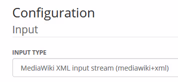 Comme vous pouvez le voir, cette application à de nombreuses options. La première option à renseigner est le type de de l’entrée. Ici nous avons un fichier XML Mediawiki, il faut donc renseigner MediaWiki XML input stream (mediawiki+xml). Si vous ne voyez pas cette ligne, c’est que vous n’avez pas correctement installé l’extension MediaWiki XML.