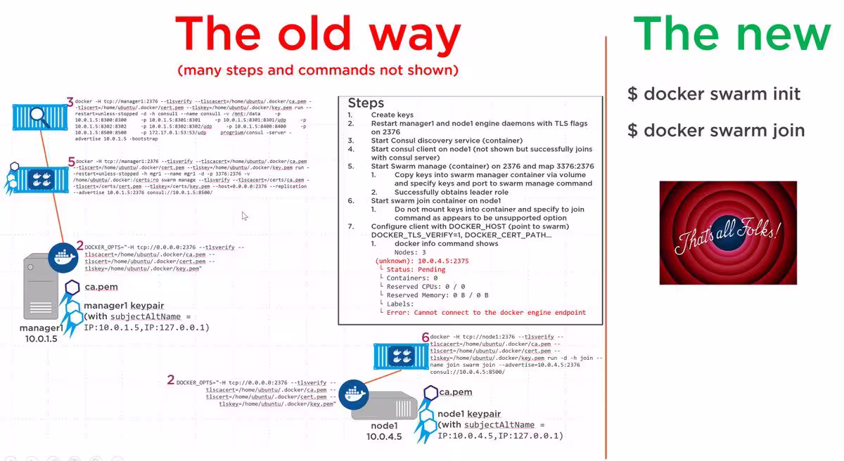 Dans cet article, j’ai essayer de vous montrer à quel point il est simple d’utiliser la fonctionnalité d’orchestration de containers Swarm. Et ça n’a pas toujours été au si simple comme le reconnaissent eux même les gens de Docker :