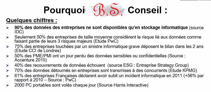 Par exemple, pour le célèbre « 75% des entreprise touchées par un sinistre informatique grave déposent le bilan dans les 2 ans (Etude CCI de Londres) ».