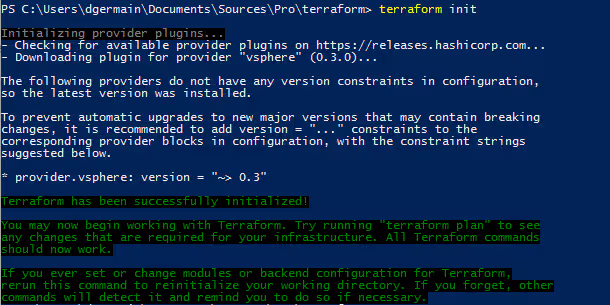Dans cet exemple, je me base sur le provider vSphere, dont vous retrouvez la documentation ici. Ce simple script va se connecter à mon vcenter, créer un répertoire test à la racine du cluster, puis créer une VM dans ce répertoire.