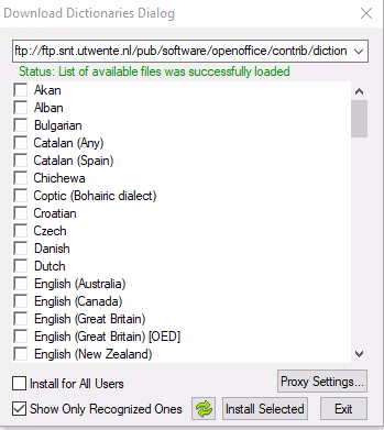 Dans la liste des miroirs disponibles pour les dictionnaires d’Open Office (car c’est de ça qu’il s’agit), j’ai pris un serveur au hasard et j’ai regardé le contenu du FTP. La requête est faite sur ftp://ftp.snt.utwente.nl/pub/software/openoffice/contrib/dictionaries/.