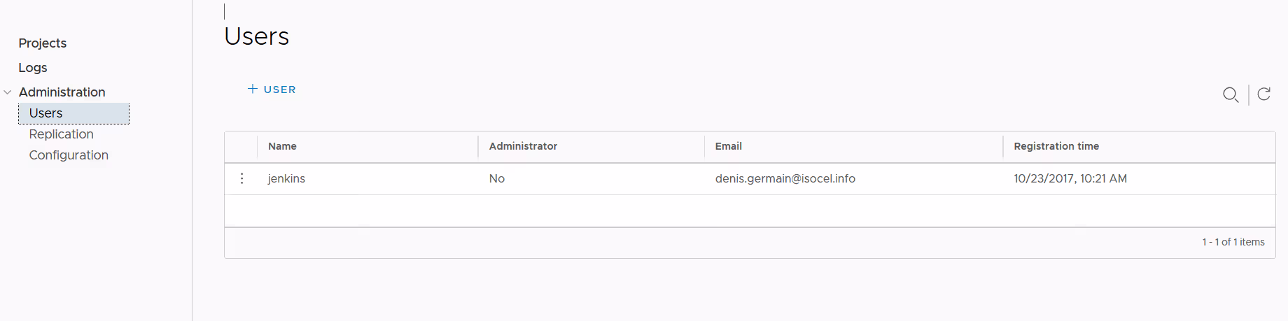 Le sous-menu Configuration permet de visualiser et modifier une partie des paramètres généraux de la plateforme. Une partie des ces paramètres proviennent de la configuration harbor.cfg renseignée lors de l’instanciation (via Ansible dans notre cas). Certains ne peuvent pas être changés depuis l’interface (comme la méthode d’authentification par exemple, mais je ne le testerai pas si j’étais vous…).
