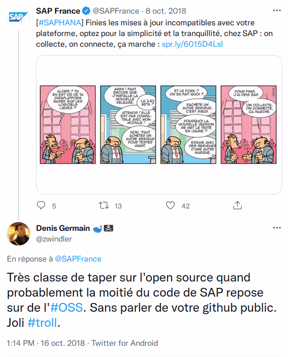Au final, les défenseurs de ce tweet vont me dire que je suis simplement mauvaise langue car c’est simplement de la communication maladroite plutôt qu’une réelle volonté de dénigrer l’open source.