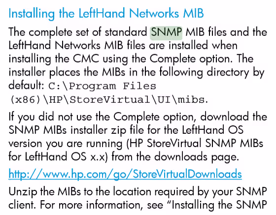 Le plus récent et le plus téléchargé, check_lhc, nécessite le téléchargement de MIB. Je les avaient trouvé sur circitor (ex. www.circitor.fr/Mibs/Html/L/LEFTHAND-NETWORKS-NUS-COMMON-CLUSTERING-MIB.php), puis de les déposer dans votre serveur Nagios/Centreon/Shinken
