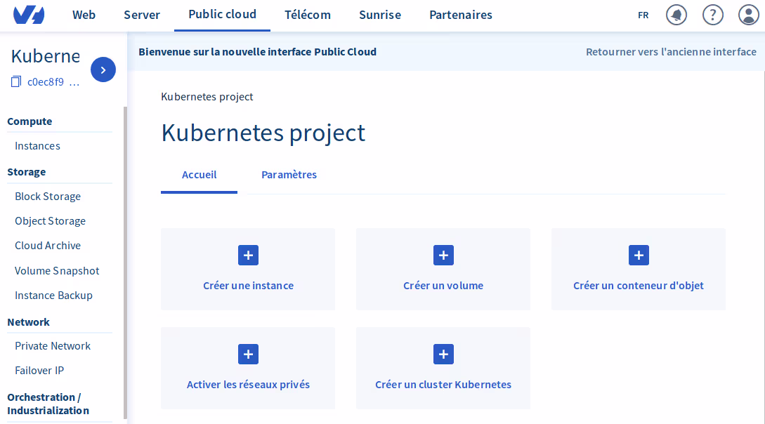 Assez parlé ! Dans mon manager d’OVH, j’ai créé un nouveau projet, que j’ai nommé de manière originale “Kubernetes Project”. Puis, j’ai créé un cluster Kubernetes en cliquant sur “Créer un cluster Kubernetes”