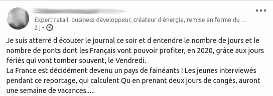 Pour illustrer mon propos, je vous invite à aller faire un tour sur LinkedIn, où le salarié (souvent un homme bizarrement) travaillant 70h / semaine est régulièrement glorifié. Autant vous dire que quand j’essaye de ramener ces gens-là à la réalité, je me prends régulièrement des “fainéants” ou autre noms d’oiseaux.