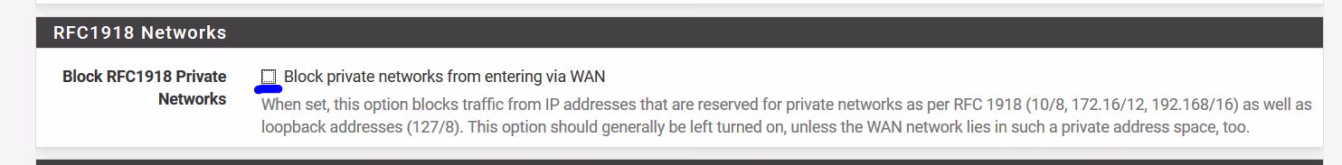 Cette option permet de bloquer les paquets qui parviennent d’un réseau privé d’entrer par l’interface WAN. Un réseau privé, c’est un réseau dont l’IP commence par 10, 172.16, ou 192.168. Et comme notre WAN est justement sur un réseau privé, eh bien cette option bloque tout.