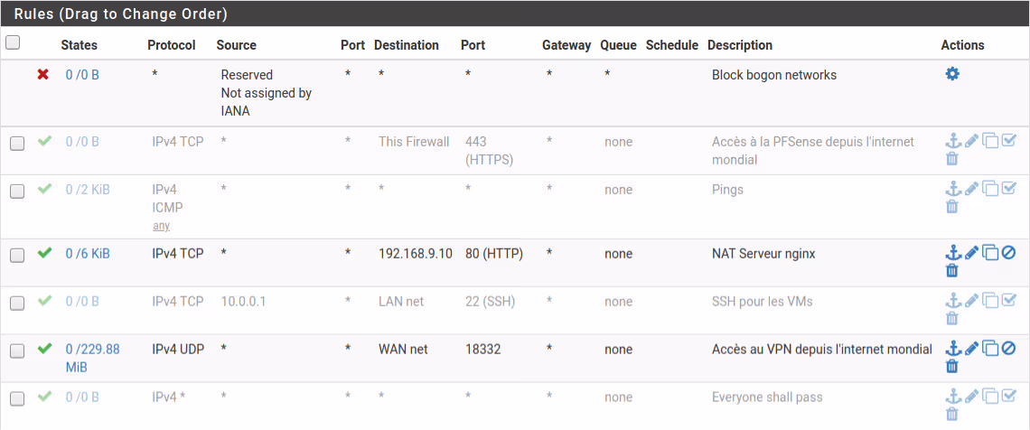 Maintenant qu’on a le VPN, on peut supprimer quelques règles dans la PFSense.