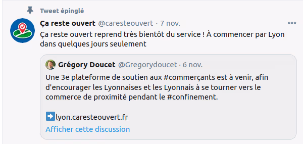 Pour savoir si un établissement est ouvert ou non, j’étais tombé lors du premier confinement sur caresteouvert. Il s’agit d’un site collaboratif ou chacun (commerçant ou simple consommateur), peut indiquer si un commerce est ouvert ou non (avec éventuellement des horaires adaptés).