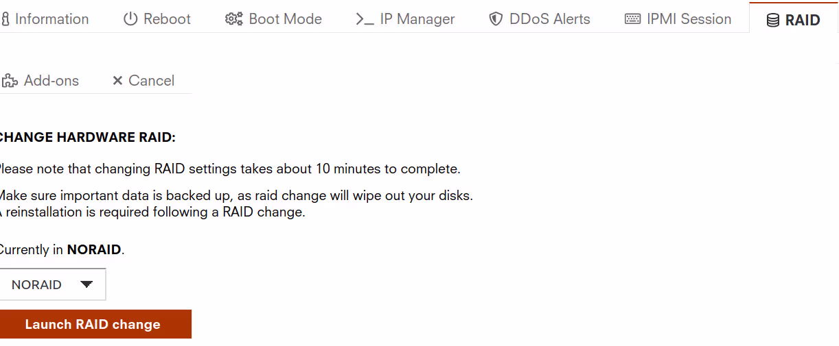Il faut changer la conf du RAID dans l’interface web et refaire une install. Si vous ne voulez pas de ZFS, vous pouvez choisir l’option RAID1 qui vous permettra d’avoir un miroir géré côté hardware (pas forcément une super idée vu qu’on est sur une config premier prix).