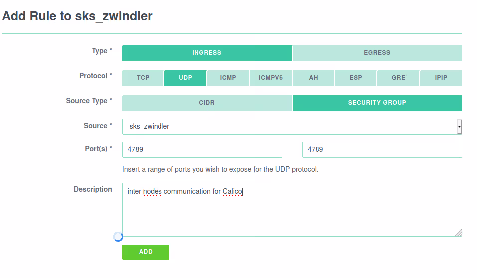 ./exo firewall add sks-zwindler-sg -d "Calico traffic" -p udp -P 4789 -s sks-zwindler-sg