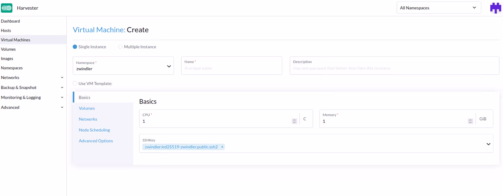 Préalablement, c’est mieux si on a créé un Namespace (oui, vous vous souvenez c’est du Kubernetes !) et uploadé une clé SSH. Le menu reste simple, on est proche de ce qu’on va trouver chez les grands cloud providers, par exemple.