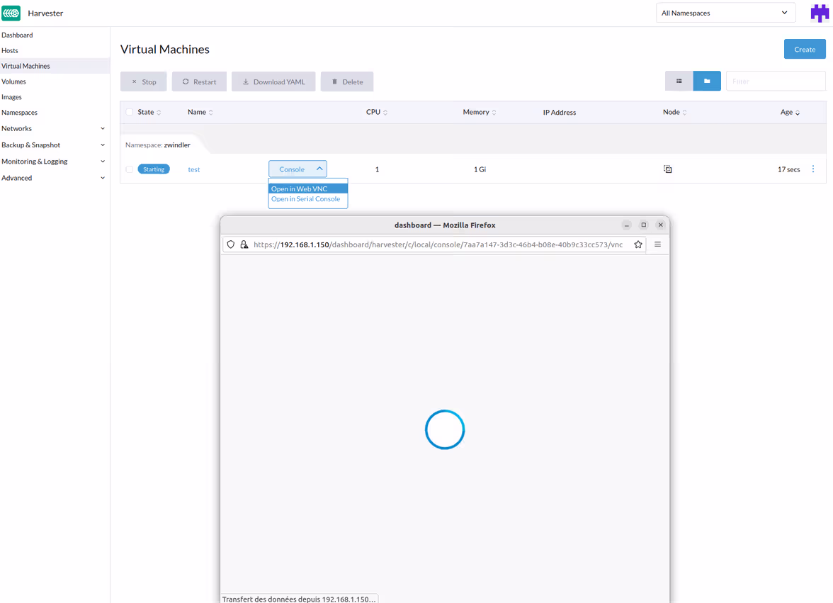 Même la navigation dans l’interface était parfois pénible. J’ai mis plusieurs minutes avant de pouvoir afficher la console VNC de ma VM. Le stockage avait du mal à se synchroniser entre les nodes.