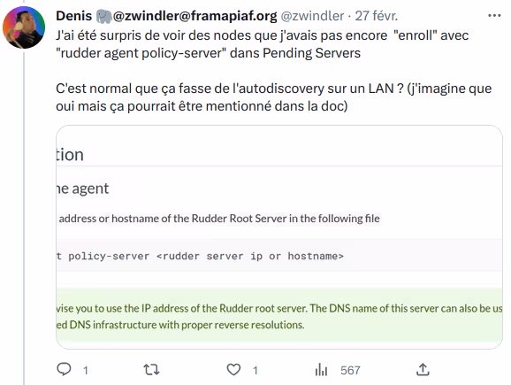 Petite subtilité, je n’ai pas eu besoin de faire cette étape dans un premier temps, car il se trouve que par défaut, les agents cherchent sur le LAN une machine s’appelant “rudder”. J’étais donc un poil surpris de ne pas voir cette info dans la doc (il faut que je fasse une PR pour corriger ça).