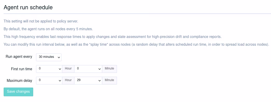 Dans le menu Administration / Settings, il existe une section Agent run schedule. Par défaut, l’ordonnancement est prévu de la façon suivante : Rudder lance les vérifications / corrections sur sa liste d’agent sur une plage de 5 minutes, le premier tiré au hasard commençant à 0 minutes (directement donc) et le dernier jusqu’à 4 minutes (1 minute avant la fin de la fenêtre de tir).