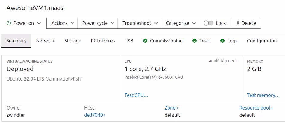 On peut ensuite aller dans virsh/LXD (selon ce qu’on a choisi) et poper des VMs depuis l’interface de MAAS.