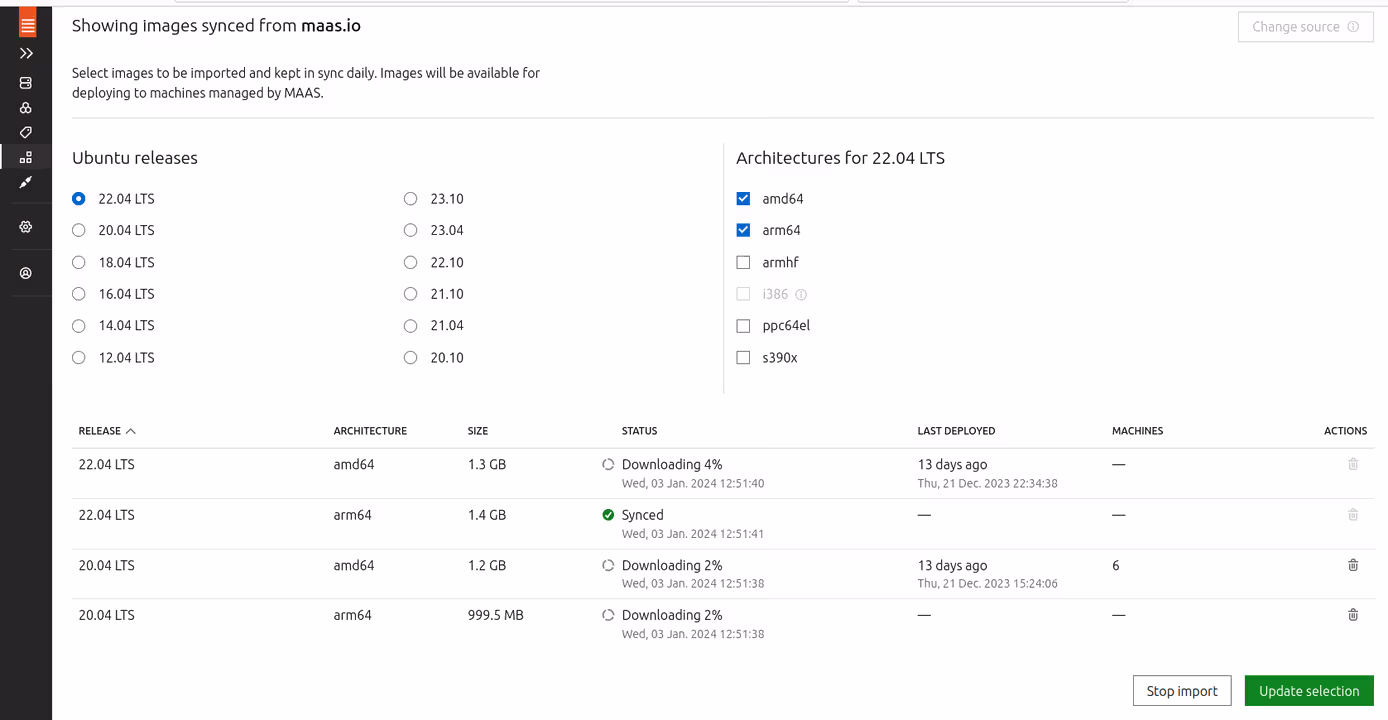 Par défaut, les OS disponibles sur MAAS proviennent d’images qui sont stockées sur maas.io. On y retrouve toutes les LTS d’Ubuntu jusqu’à la 12.04 (!?!) ainsi que les non-LTS de la 20.10 à la 23.10, et pour plusieurs architectures.