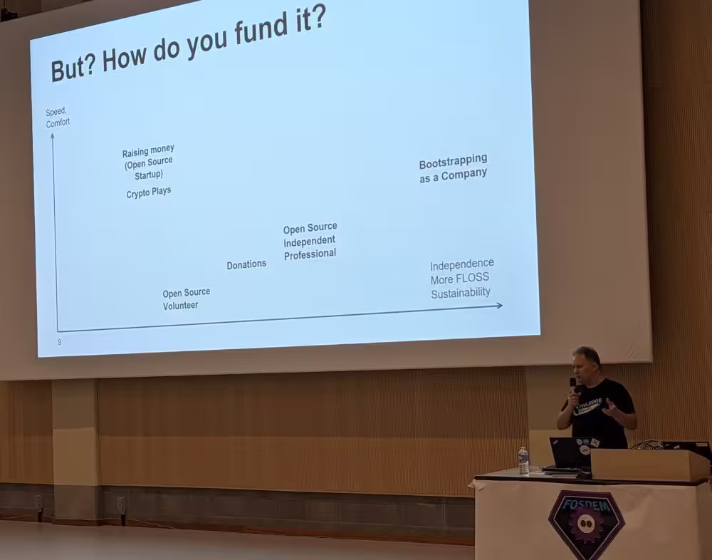 J’ai la façon qu’a Ludovic de voir l’open source. Contrairement au modèle open core (une partie du produit est open source, le reste closed source), Ludovic croit en un modèle d’Open source payant (l’open source, ce n’est pas gratuit), soit bien le support, soit en faisait payer le produit, mais en gardant tout open source.