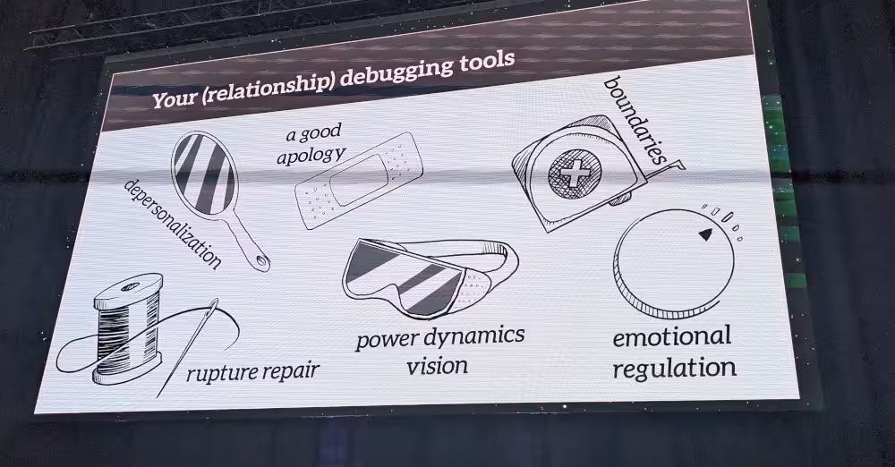 Grosso modo, ça se résume en “We s**k at human relationships”. Au travers du talk, avec la juste dose d’humour et d’expériences personnelles, Rachel nous donne une liste d’outils pour améliorer ça.