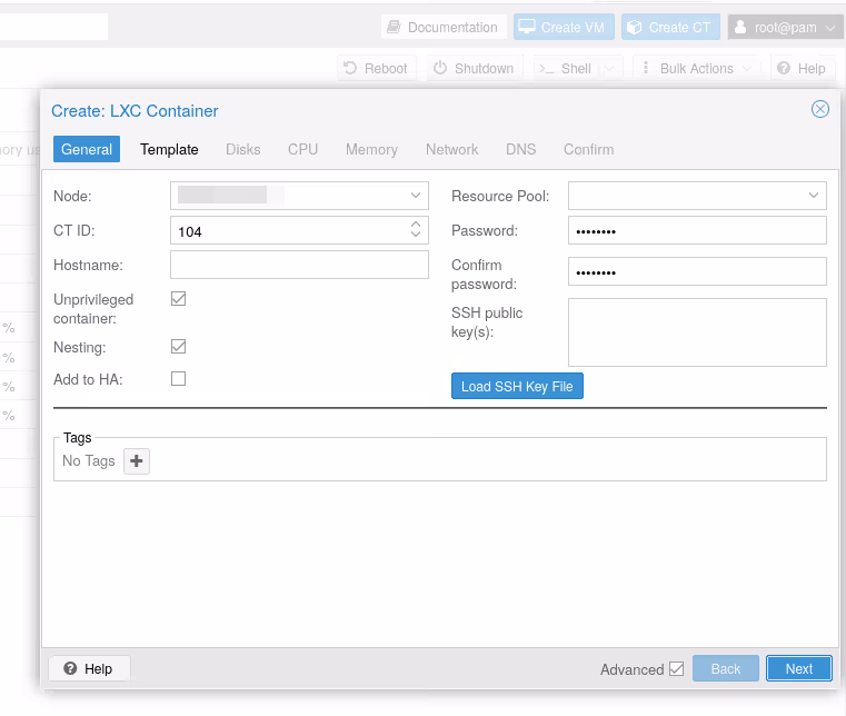 Maintenant que le template (l’image OCI) est disponible sur notre stockage, on peut créer un container LXC comme d’habitude. On clique sur “Create CT”, on donne un CT ID, un password :