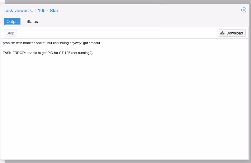 TASK ERROR: unable to get PID for CT 105 (not running?)