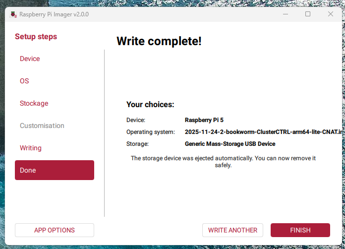 Pour le Raspberry Pi 5, dans mon cas le fichier est donc 2025-11-24-2-bookworm-ClusterCTRL-arm64-lite-CNAT.img.xz