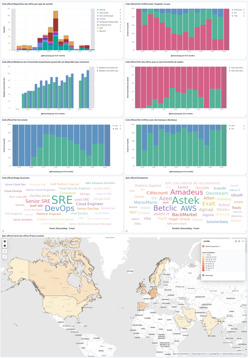 Celui-là n’a jamais été publié, mais tant qu’à sauvegarder, autant tout garder. Depuis 2019, je complète un Google Sheet avec toutes les offres d’emploi que m’envoient les recruteurs : fourchettes de salaires quand elles sont disponibles, type d’entreprise, remote ou non, étranger ou pas (et le pays concerné le cas échéant). J’avais importé tout ça dans Kibana pour avoir un dashboard interactif.